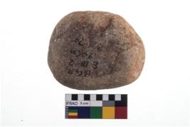 | Description / विवरण | A partially broken specimen of roughly round shaped hammer stone with battered periphery along with the circumference. It is broken from one end. |