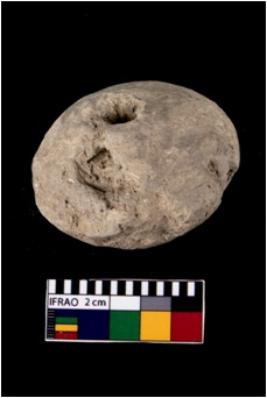 | Description / विवरण | A partially broken grey ware irregular shaped wheel with an tubelar perforation at its center |