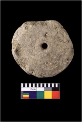 | Description / विवरण | A partially broken grey ware irregular shaped terracotta wheel with an tubelar perforation at its center |
