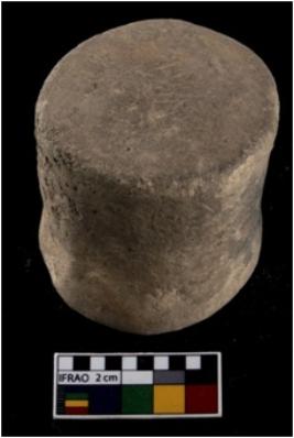 | Description / विवरण | A complete specimen of a terracotta weight. It is cylindrical in shape and its height is equal with the with of its base |