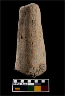 | Description / विवरण | A partially broken specimen of a medium sized terracotta cylindrical object with elongated body, rough surface with a slight depression at top. It is devoid of any kind of wash. It is red ware, rough surface ,medium in fabric and medium fired. It s base is broken. It is probably a stopper. |