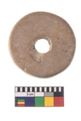 | Description / विवरण | The specimen is a fragmented terracotta disc, it is circular in shape, broad at circumferance, and has a single perforation going through its center. It is broken. |