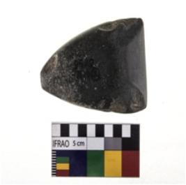 | Description / विवरण | Intact, small size triangular beautifully polished axe, with a sharp bevelled edge, there is a shallow scar on the right side |
