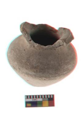 | Description / विवरण | The specimen is small pot with a flat, high base. Globular body, short neck and a out turned rim. The core is coarse red and surface is covered with lime. |