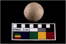 | Description / विवरण | A complete specimen of red ware teracotta sling ball with rough surface, probably a birdshot |