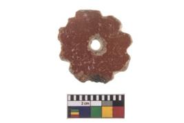 | Description / विवरण | A terracotta pendent with central perforation. |