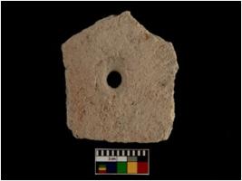 | Description / विवरण | A partially broken specimen of a black and red ware rectangular shaped terracotta perforated disc with even perforation.. This object is having broken surface. It appears to be of wheel made with medium coarse clay and also well fired. This disc is having significant amount of chaff on its outer surface |