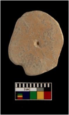 | Description / विवरण | A partially broken specimen of a red ware circular shaped terracotta perforated disc with uneven perforation. The edges of this disc are eroded and broken. The perforation of the discs widens near the edges and narrow inside. It is having a smooth surfaces on the both side . It is made of well levigated clay and it is well fired. |