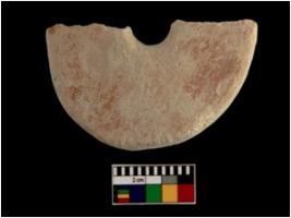 | Description / विवरण | A partially broken specimen of a red ware circular shaped terracotta perforated disc with uneven perforation. The perforation of the discs widens near the edges and narrow inside. It is having a smooth surfaces on one side and comparatively rough on other . It is made of well levigated clay and it is well fired. |