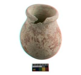 | Description / विवरण | Almost intact small pot, a small piece of the rim and neck portion is broken, flat base, red slip is intact in patches |