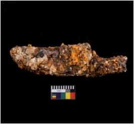 | Description / विवरण | Partially broken iron knife, slightly curvy, highly corroded |