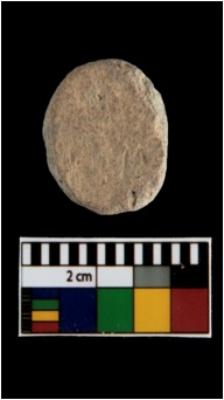 | Description / विवरण | A complete specimen of a red ware roughly circular game pice with rough surface. |