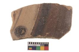 | Description / विवरण | Specimen of black on red ware with black decorative Circle between lines geometric painting. |