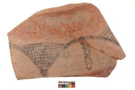 | Description / विवरण | Specimen of black on red ware with black decorative Joint curves and lattice pattern on joint geometric painting. |