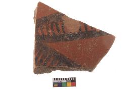 | Description / विवरण | Specimen of black on red ware with black decorative Joint leaves with line pattern geometric painting. |