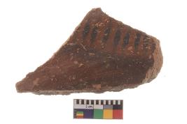 | Description / विवरण | Specimen of black on red ware with black decorative Vertical lines between horizontal lines geometric painting. |