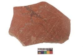 | Description / विवरण | Specimen of black on red ware with black decorative Joint curves with wavy ends geometric painting. |