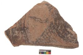 | Description / विवरण | Specimen of black on red ware with black decorative Joint lattice triangles and wavy lines between two parallel cicles geometric painting. |