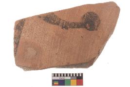 | Description / विवरण | Specimen of black on red ware with black decorative Circle at the end of curved line geometric painting. |