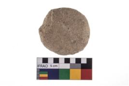 | Description / विवरण | A partially broken specimen of a stone disc. The edge of the disc is partially broken and one side of the disc is having smooth surface where as other side is rough. |