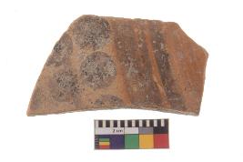 | Description / विवरण | Specimen of black on red ware with black decorative Circles between lines geometric painting. |