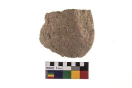 | Description / विवरण | A Broken specimen of a irragullar shaped muller stone with battered surfaced. |