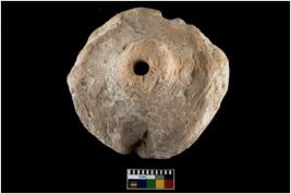 | Description / विवरण | A partially broken specimen of toy cart wheel. It is red in colour with roughly circular in shapewith perforation. |