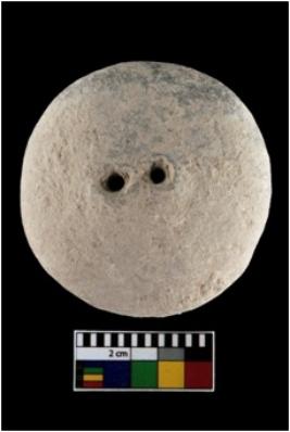 | Description / विवरण | A complete specimen of toy button . It is circular in shape and has two perforations. |