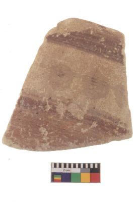 | Description / विवरण | Specimen of black on red ware with black decorative Circles between lines geometric painting. |