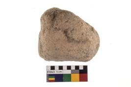 | Description / विवरण | A complete specimen of a oval shaped mueller stone with battered surfaced and truncated end to hold the object. |