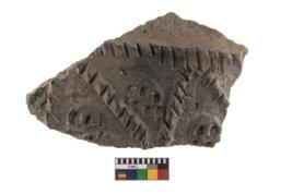 | Description / विवरण | A fragment of a pot sherd bearing applique horizontal bands and loops alternated by applique roundels. |