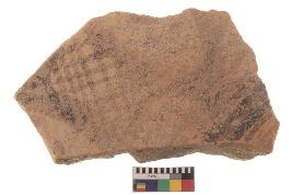 | Description / विवरण | Specimen of black on red ware with black decorative Lattice pattern geometric painting. |