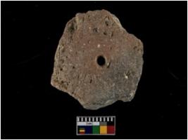 | Description / विवरण | A Complete specimen of a red ware roughly circular shape terracotta perforated disc with rough surface and uneven perforation. It is having a significant amount of Chaff in the clay.. |