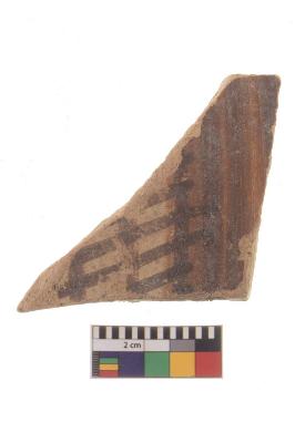 | Description / विवरण | Specimen of black on red ware with black decorative Lattice pattern geometric painting. |
