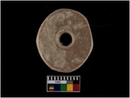 | Description / विवरण | A Complete specimen of a micacious red ware circular shaped terracotta perforated disc with one side rough and other smooth surface It is wheel made and with well levigated clay |