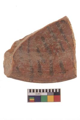 | Description / विवरण | Specimen of black on red ware with black decorative Horizontol parallel lines geometric painting. |