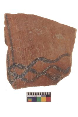 | Description / विवरण | Specimen of black on red ware with black decorative Joint wavy lines geometric painting. |