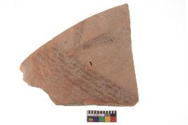 | Description / विवरण | Specimen of black on red ware with black decorative Joint half circles and parallel lines geometric painting. |