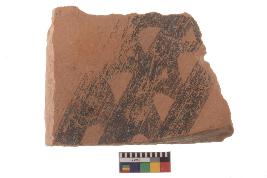 | Description / विवरण | Specimen of black on red ware with black decorative Joint curves between lines geometric painting. |