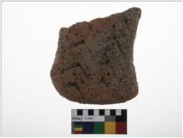 | Description / विवरण | A double axe head shaped specimen of a skin rubber with chevron design over its both suface |