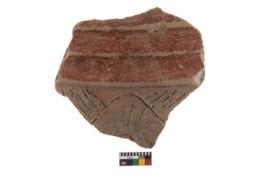 | Description / विवरण | A plain red-slipped corrugated sherd with decoration of internally hatched double line forming a wavy pattern. The empty spaces are filled in by thin incised slanting lines. |