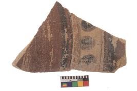 | Description / विवरण | Specimen of black on red ware with black decorative Circles between lines geometric painting. |