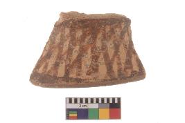 | Description / विवरण | Specimen of black on red ware with black decorative Curves lattice pattern geometric painting. |