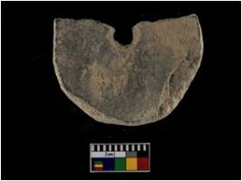 | Description / विवरण | A partially broken specimen of a grey ware circular shaped terracotta perforated disc with even perforation.. This object is having rough texture on one side and smooth on the inner side. It appears to be of well made with medium coarse undired clay . It contains groove marks on the inner side near the perforation. |