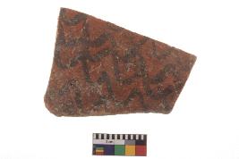 | Description / विवरण | Specimen of black on red ware with black decorative Connected wavy lines geometric painting. |