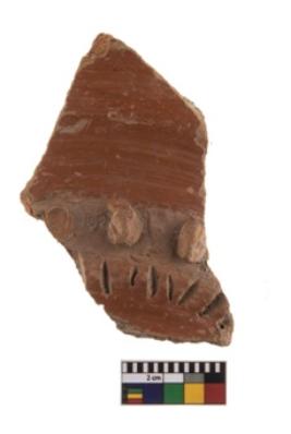 | Description / विवरण | A fragment of a pot bearing a prominent ridge externally below which are applique roundels and incised slanting lines. |