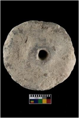 | Description / विवरण | A complete specimen of wheel. It is ochre in colour with perforation. |