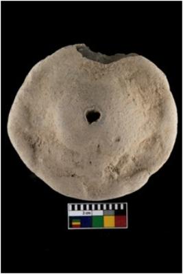 | Description / विवरण | A partially broken specimen of wheel. It is grey in colour with perforation. |