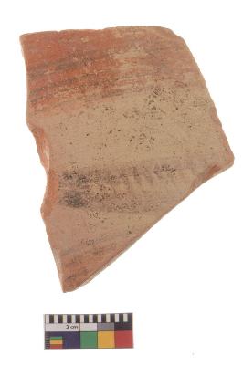 | Description / विवरण | Specimen of black on red ware with black decorative Parallel horizontal lined leaf between lines geometric painting. |