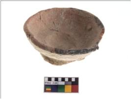 | Description / विवरण | A partially broken specimen of a terracotta lamp, circular on plan, with circular rim and circular base which shows a clear string mark where it has been cut from the potter s wheel. It is made of red ware, fine fabric, well-fired. |